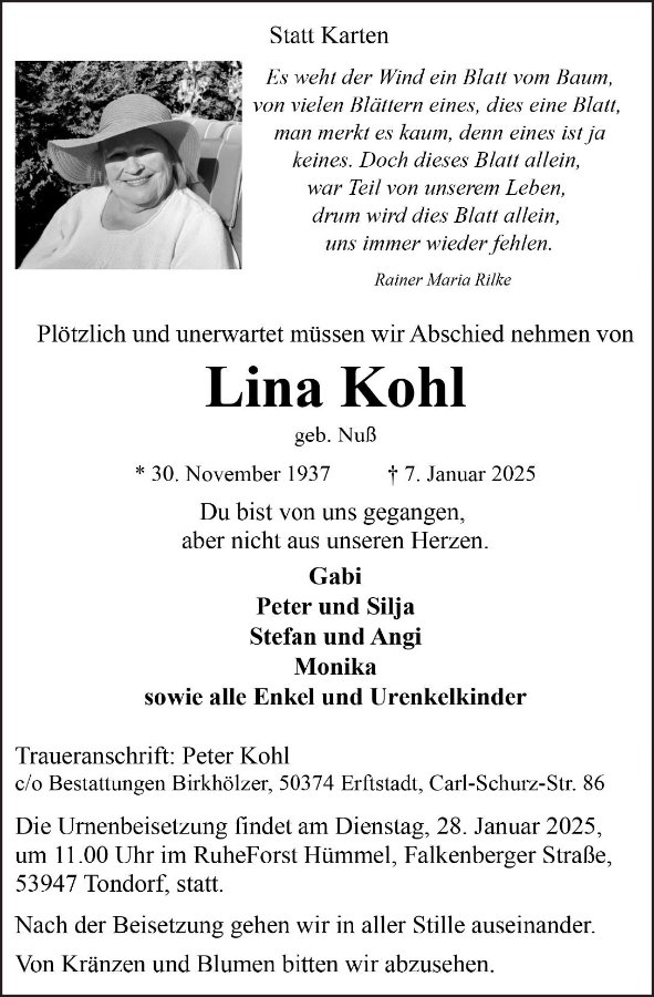wir wünschen Ihnen von Herzen viel Kraft, dass Sie Menschen um sich haben, die Ihnen in dieser schweren Zeit beistehen und Halt geben. Zusätzlich können Sie auf dieser Gedenkseite Erinnerungen teilen und so das Andenken gemeinsam wachhalten.